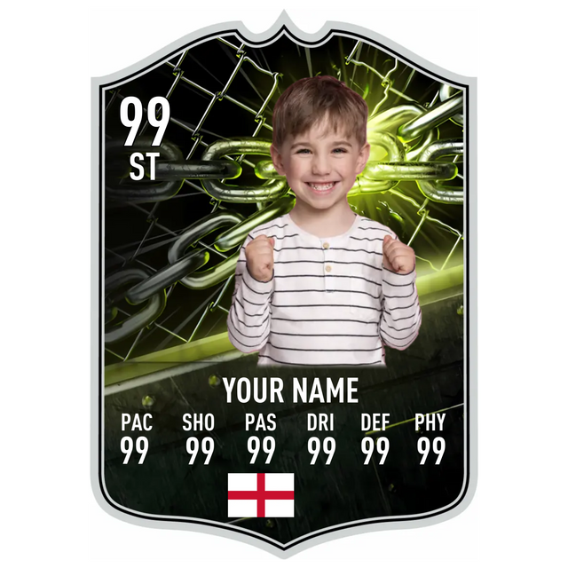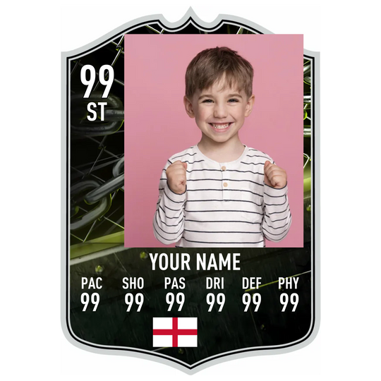 All Star Gifts brings you the ultimate personalised football cards loved by fans worldwide. With our simple online card creator, you can design your very own pro-style football card β complete with your name, photo, club details, and custom skill ratings.