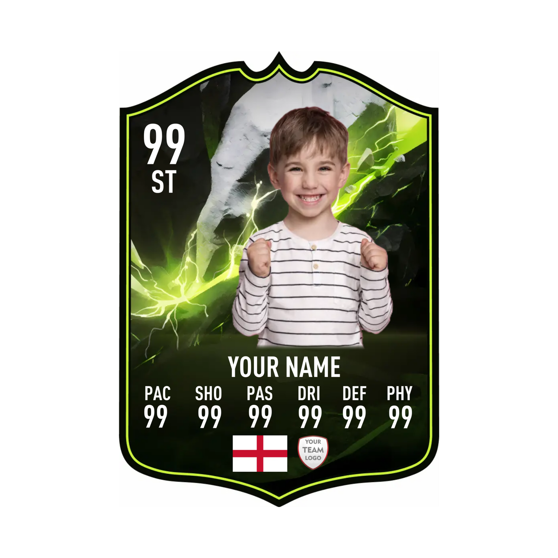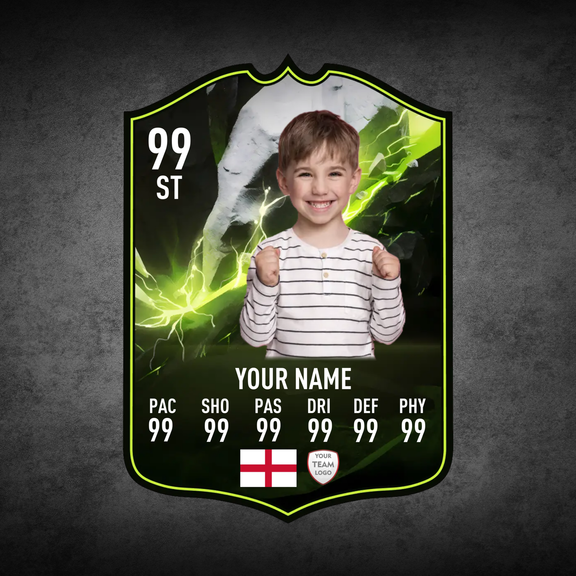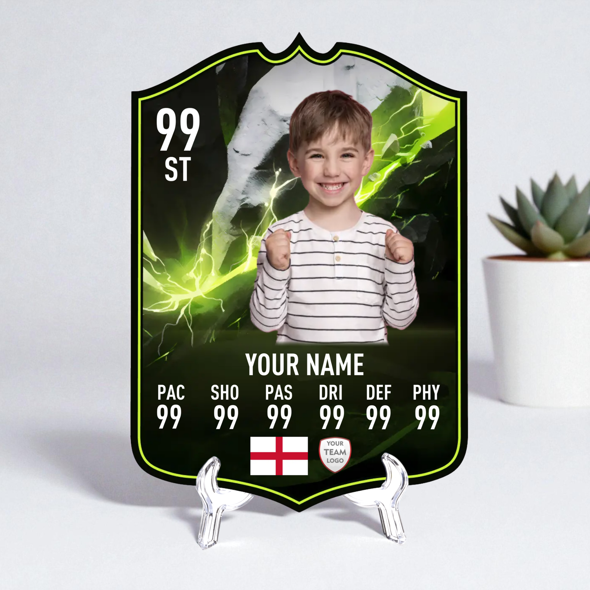 Create your own FC25 Showdown Plus football card in minutes with our easy-to-use online card builder. Upload your photo, add your name, position, club, and custom stats – and preview it live before ordering. Every card is printed to perfection and backed by our All Star Gifts Gold Standard Guarantee for professional quality and lasting brilliance.