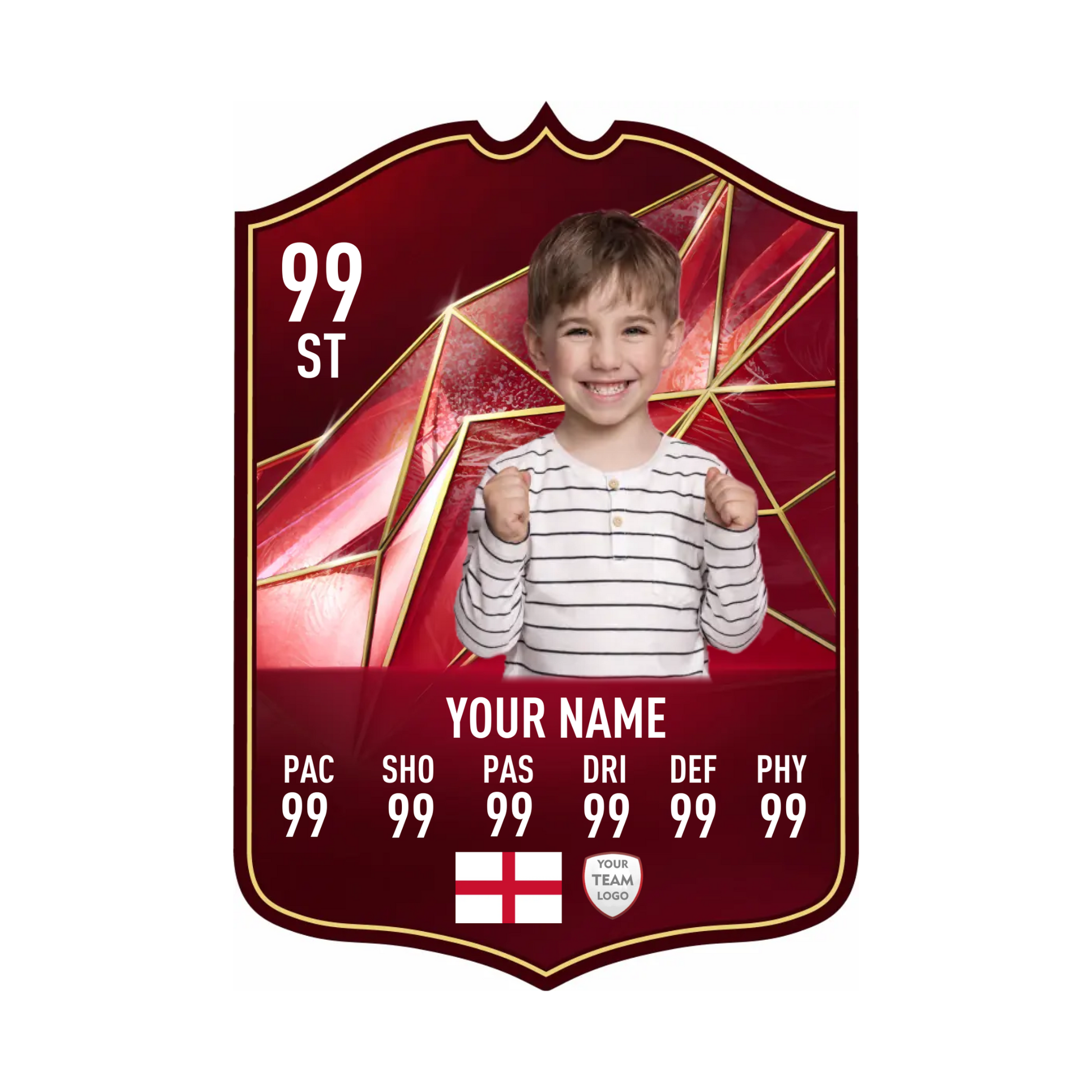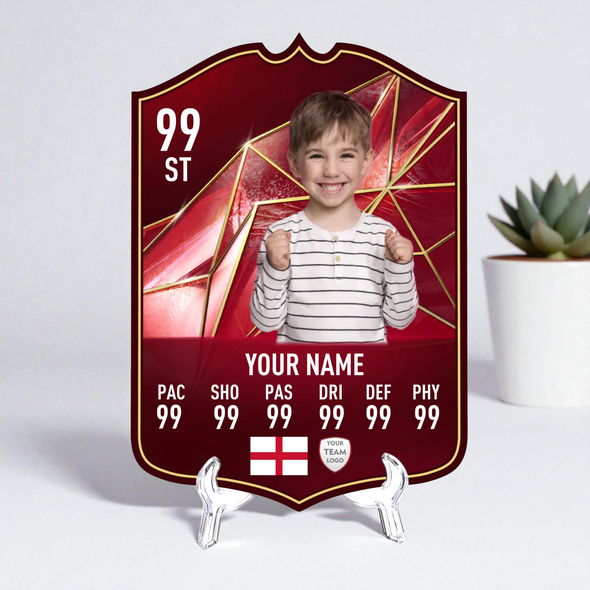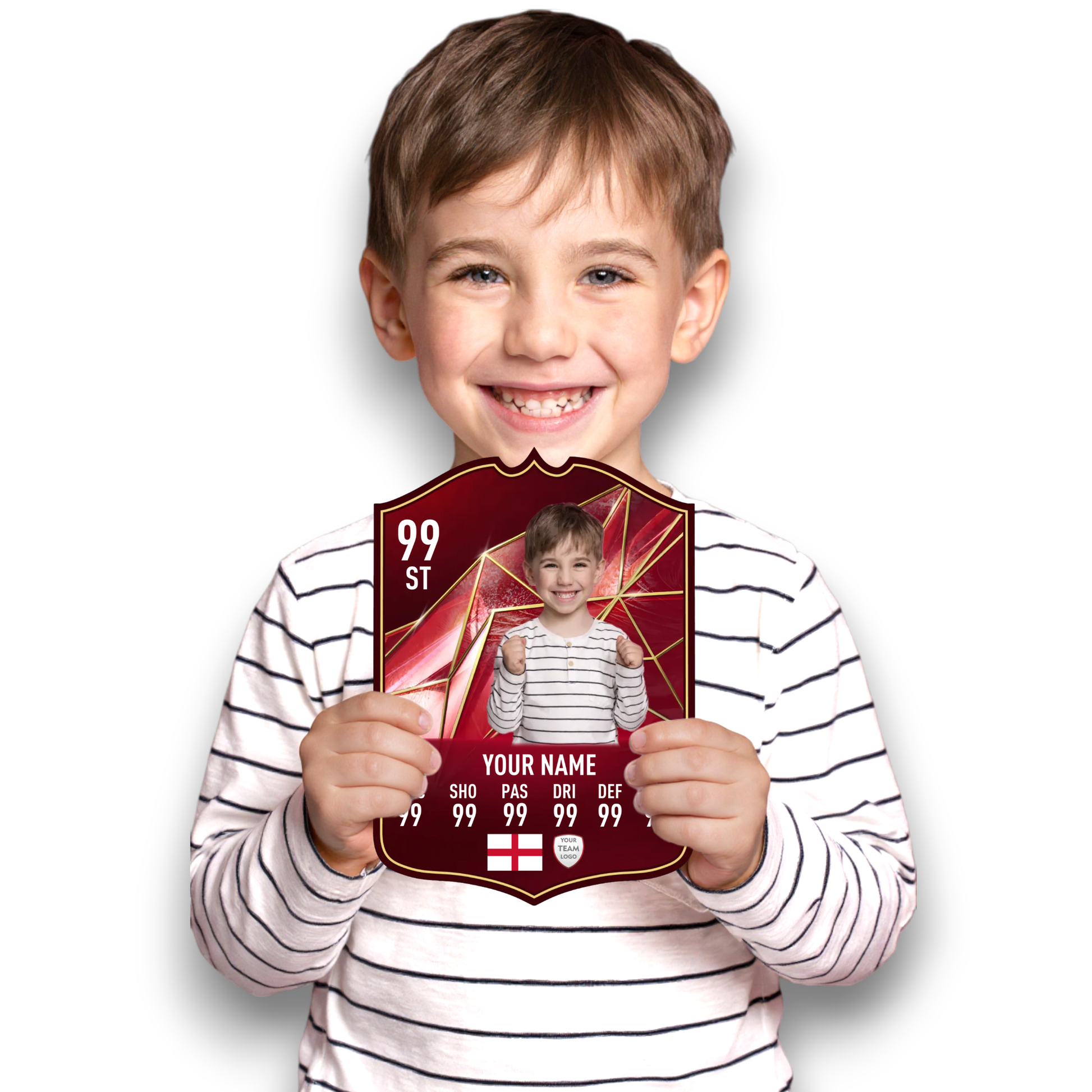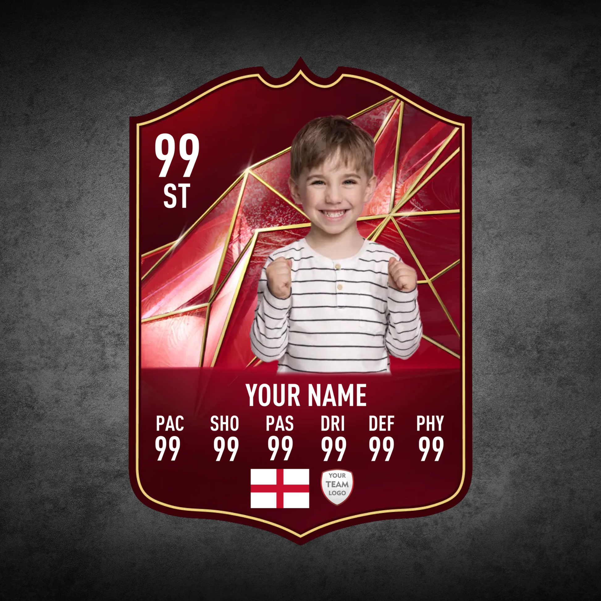 Create your own FC25 World Tour football card in minutes with our easy-to-use online card builder. Upload your photo, add your name, position, club, and custom stats – and preview it live before ordering. Every card is printed to perfection and backed by our All Star Gifts Gold Standard Guarantee for professional quality and lasting brilliance.